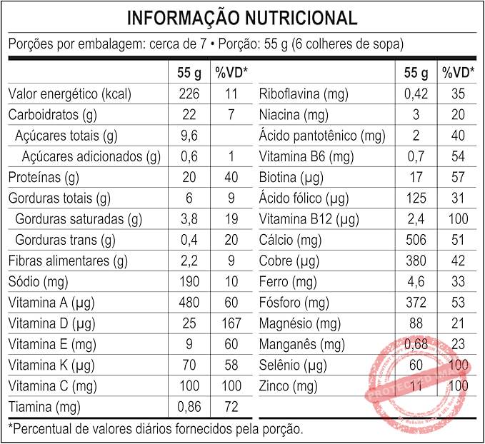 Leite integral, maltodextrina, proteína de soro do leite concentrada, proteína de soja isolada, polidextrose, caseinato de cálcio, colágeno hidrolisado, minerais (sais de magnésio do ácido cítrico, fosfato tricálcico, hidrogênio fosfato dipotássico, citrato de cálcio tetraidratado, pirofosfato férrico, sulfato de zinco, sulfato de manganês, sulfato cúprico e selenato de sódio), vitaminas (L-ascorbato de sódio, acetato de DL-alfa-tocoferila, nicotinamida, D-pantotenato de cálcio, cloridrato de piridoxina, tiamina mononitrato, acetato de retinila, riboflavina, ácido fólico, fitomenadiona, colecalciferol, D-biotina e cianocobalamina), reguladores de acidez citrato de potássio, hidróxido de potássio e ácido cítrico e emulsificante lecitina.