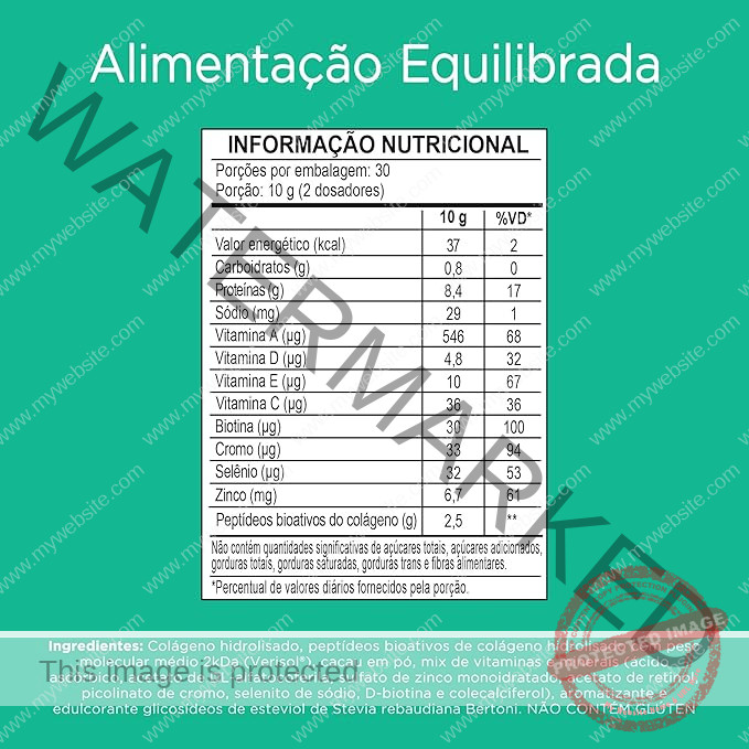 Aditivos ‎Colágeno hidrolisado, colágeno hidrolisado bioativo (Verisol®), mix de vitaminas e minerais [vitamina C (ácido ascórbico), vitamina E (DL alfa-acetato de tocoferol), zinco (sulfato de zinco mono-hidratado), vitamina A (acetato de retinol), cromo (picolinato de cromo), selênio (selenito de sódio), vitamina H (biotina) e vitamina D (colecalciferol)], acidulante ácido cítrico, aroma sintético idêntico ao natural e edulcorante estévia e corante betacaroteno. “Não contém quantidades significativas de gorduras totais, gorduras saturadas, gorduras trans e fibra alimentar. (*)%Valores Diários de Referência com base em uma dieta de 2000 kcal, ou 8400 kJ. Seus valores diários podem ser maiores ou menores dependendo de suas necessidades energéticas.”