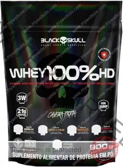 Whey 100% HD é mais um mega suplemento da linha caveira preta! Composto por três tipos de whey protein (concentrado, isolado e hidrolisado), ele é uma ótima opção para auxiliar no ganho de massa muscular! Além disso, sua composição conta também com a adição de BCAA, aminoácidos de cadeia ramificada que contribuem para uma melhor recuperação pós-treino.  INGREDIENTES: Proteína concentrada do soro do leite, proteína isolada do soro de leite, proteína hidrolisada do soro do leite, l-leucina, l-isoleucina, l-valina, aromatizante, espessante goma xantana, corante vermelho beterraba, acidulante ácido cítrico, edulcorantes sucralose e acessulfame de potássio. CONTÉM LACTOSE. NÃO CONTÉM GLÚTEN. COMO CONSUMIR WHEY 100% HD? Misture 3 colheres de sopa (aprox. 30g) de Whey 100% HD em 150 ml de água, ou de acordo com a consistência desejada, e consuma uma vez ao dia ou de acordo com a orientação de um profissional especializado. Recomendação para adultos acima de 19 anos de idade. WHEY PROTEIN Um dos suplementos mais consumidos do mundo atualmente por diversas áreas no esporte como também na nutrição clínica, derivado do soro do leite, mais conhecido como Whey Protein, garante proteína de alto valor biológico com objetivos de manutenção muscular, auxiliar no anabolismo e recuperação das fibras musculares de praticantes de atividades físicas em geral até em pacientes que necessitam de uma dieta enteral. As proteínas obtidas a partir do soro do leite são classificados conforme o seu grau de processamento, como: proteínas concentradas, isoladas e hidrolisadas. SRO – um processo de refinação que remove os contaminantes usando pressão da água para forçar as moléculas através de uma membrana semipermeável. Durante esse processo, os contaminantes são filtrados e lavados, deixando a proteína mais pura.