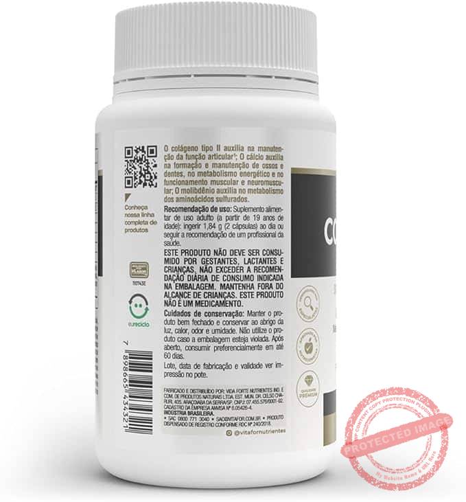 INGREDIENTES: Metilsulfonilmetano (MSM), fosfato tricálcico (cálcio), extrato de alho em pó (Allium sativum L.)- alicina, colágeno de frango com colágeno tipo Il não desnaturado, hialuronato de sódio obtido pela fermentação de Streptococcus zoopidemicus (ácido hialurônico), ácido ortosilícico estabilizado em cloreto de colina (silício), molibdato de sódio diidratado (molibd?nio), agente de massa celulose microcristalina e antiumectante estearato de magnésio. Composição da cápsula: hidroxipropilmetilcelulose (HPMC), água purificada, opacificador (corante carbonato de cálcio e amido modificado), gelificante carragena e regulador de acidez acetato de potássio. ALÉRGICOS: CONTÉM PEIXE. NÃO CONTÉM GLÚTEN. SUGESTÃO DE USO: Ingerir 1,5 (2 cápsulas) ao dia, preferencialmente antes das principais refeições ou seguir a recomendação de um profissional de saúde.