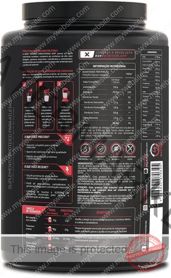 WHEY PROTEIN CONCENTRADO (900g) – DUX NUTRITION       O Whey Protein Concentrado Dux Nutriton é composto por proteínas de alto valor biológico e rápida absorção, além de gorduras essenciais, carboidratos e uma ampla gama de aminoácidos, fundamentais para garantir a síntese muscular acelerada após a prática de esportes. É ideal para ser consumido antes e depois de treinos, mas também pode fazer parte do café da manhã ou servir como um lanche entre as refeições, e em outros momentos conforme a orientação do seu nutricionista.      Se há um nutriente indispensável, é a proteína. Ela é feita de aminoácidos, que são os blocos de construção do nosso corpo. A proteína do soro do leite, em inglês ?Whey Protein?, é uma das fontes de aminoácidos de melhor absorção, maior até que o frango ou peixe. Isso torna o Whey uma forma conveniente de ingerir proteína, melhorando a saúde, o bem-estar e os resultados dos treinos.   BENEFÍCIOS: > Não contém goma xantana, complexos vitamínicos à base de maltodextrina, espessantes, estabilizantes, conservantes ou qualquer outro ingrediente inferior;> Contém corantes 100% naturais, sem ingredientes artificiais;> O nome diz tudo: Whey Protein Concentrado 100% puro, com transparência total, do nome do produto à lista de ingredientes;> Matéria-prima premium importada, com alto teor de leucina, desenvolvida para criar um produto com sabor real e marcante;> Valores nutricionais robustos, sem excessos, com quantidades ideais de carboidratos e gorduras do leite;> 20g de proteína;> Proteína moderna, desenvolvida por especialistas para atletas de esportes de performance (bodybuilding, crossfit e artes marciais),  pessoas que buscam uma proteína com baixa caloria (para snacks fit e receitas sem culpa) e pessoas que buscam uma proteína ultrapura de altíssima qualidade.